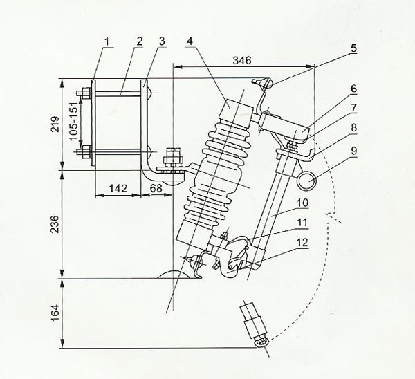RW4跌落式熔斷器在正常運(yùn)行時(shí),熔絲管借助熔絲張緊后形成閉合位置。當(dāng)系統(tǒng)發(fā)生故障時(shí),故障電流時(shí)熔絲迅速熔斷,并形成電弧,消弧管受電弧灼熱,分解出大量的氣體,使館內(nèi)形成很高壓力,并沿管道形成縱吹,電弧被迅速拉長(zhǎng)而熄滅。熔絲熔斷后,下部動(dòng)觸頭失去張力二下翻,鎖緊機(jī)械,釋放熔絲管,熔絲管跌落,形成明顯的開(kāi)斷位置。當(dāng)需要拉負(fù)荷時(shí),用絕緣桿拉開(kāi)動(dòng)觸頭,此時(shí)主動(dòng)、靜動(dòng)觸頭仍然接觸,繼續(xù)用絕緣桿拉動(dòng)觸頭,輔助觸頭也分離,在輔助觸頭之間產(chǎn)生電弧,電弧在滅罩狹縫中被拉長(zhǎng),同時(shí)滅弧罩產(chǎn)生氣體,在電流過(guò)零時(shí),將電弧熄滅。